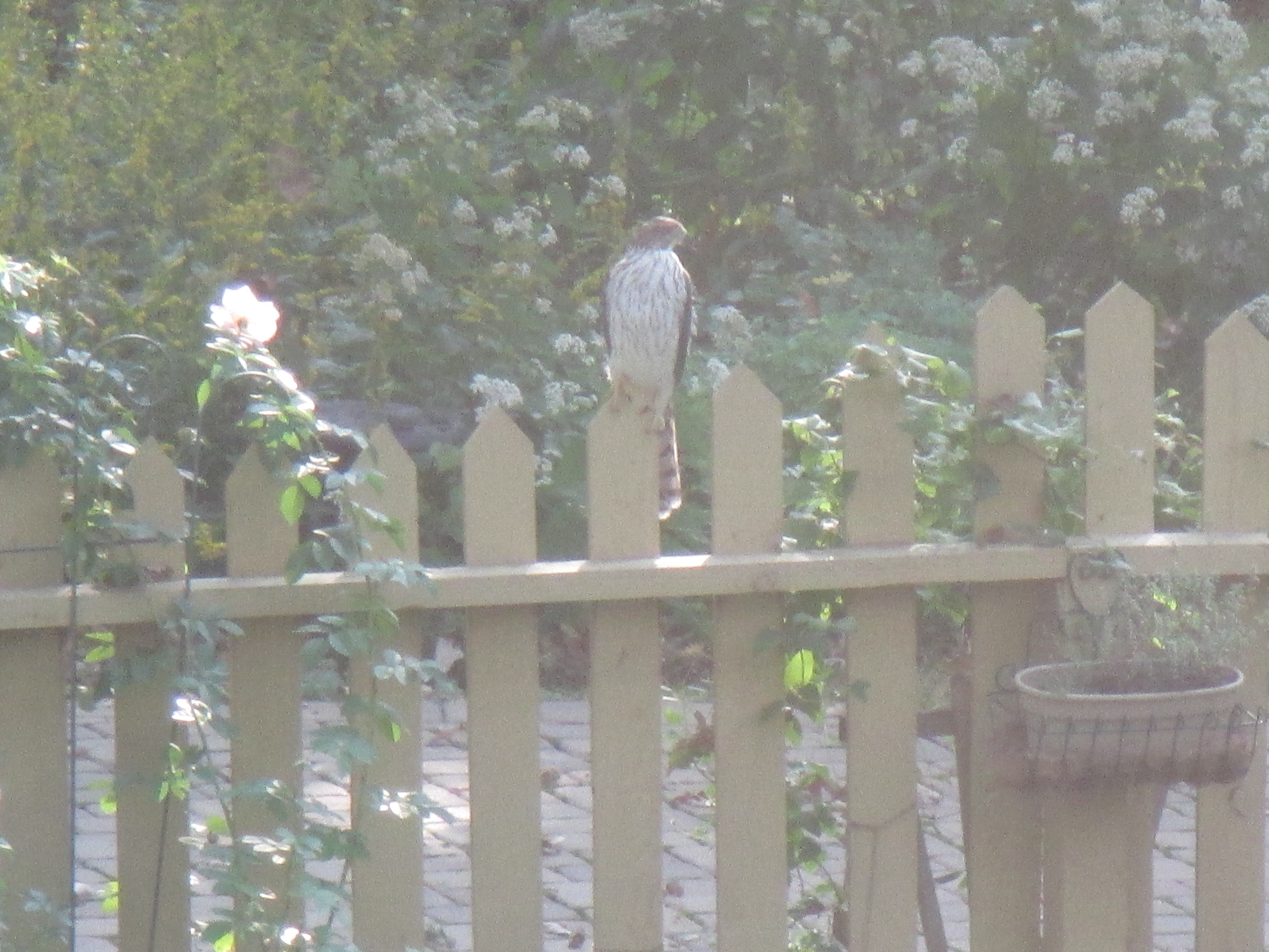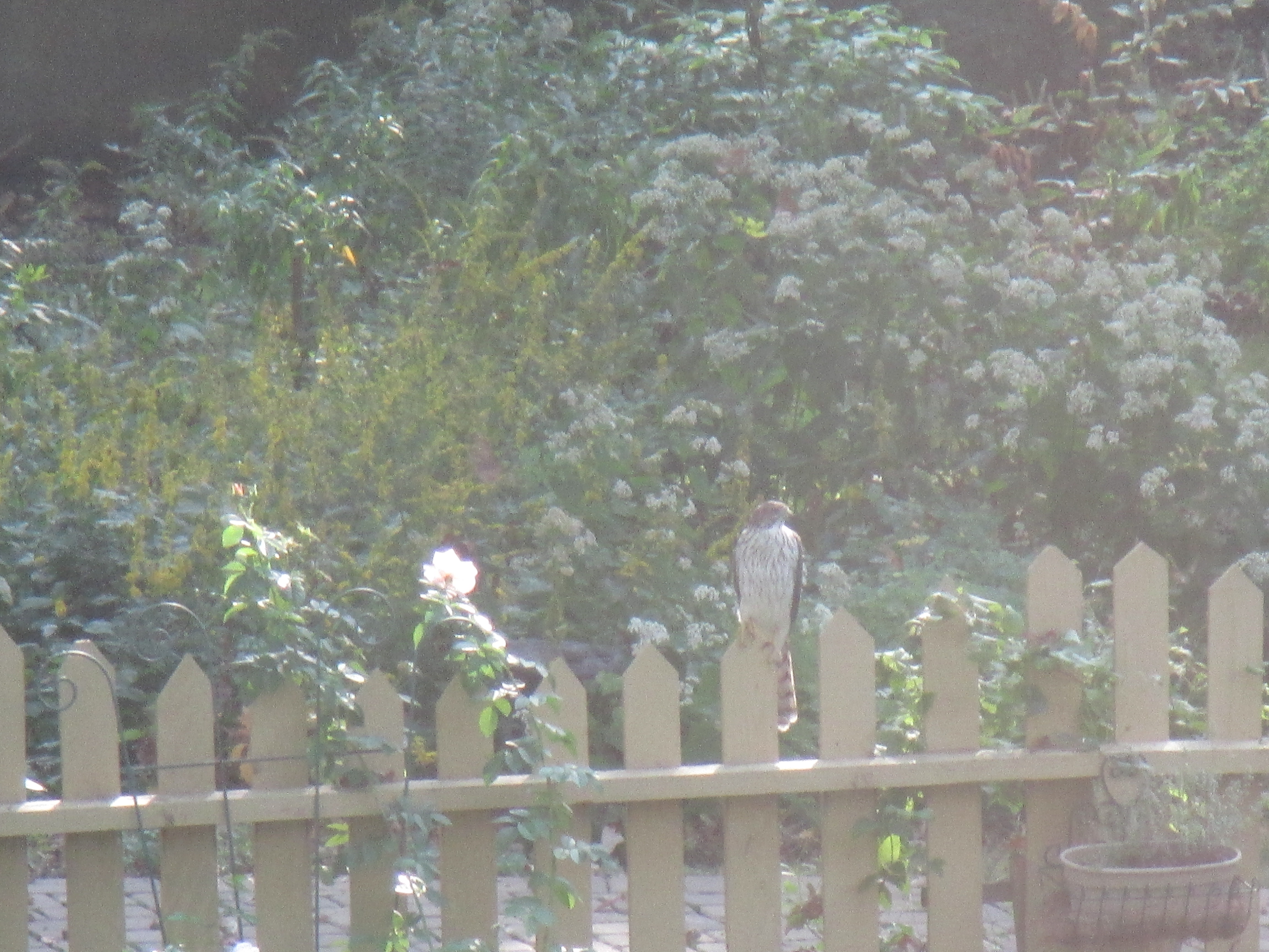 Earlier this summer, I’d gotten a pretty good look at it swooping over the alleyway between houses. And then last week, I was witness to it swooping down to try to snag a squirrel off a tree. No lie. The squirrel was a bit too big and skittish for the hawk to grab, but it was a gutsy attempt and certainly left my eyes round with surprise! The squirrel proceeded to squall in shock for about half an hour, (to the displeasure of my sensitive ears), an acorn still clutched in its mouth, completely unharmed but scared out of its wits…