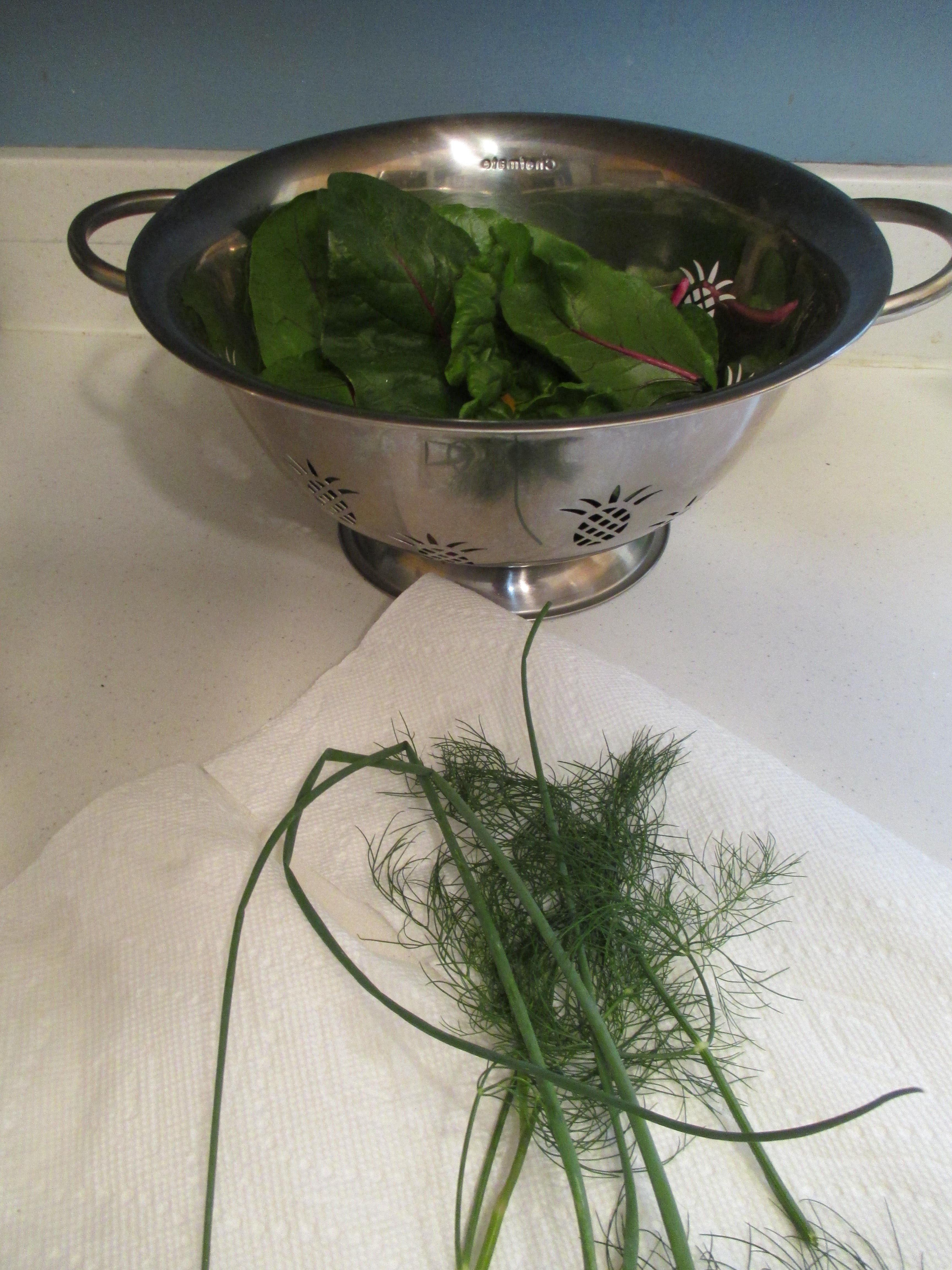 I was gifted with a bag of lettuce, Swiss chard, dill, rosemary, chives and itty bitty tomatoes. Life is good! Have you ever sauteed Swiss chard with a little olive oil and garlic? Takes 2 minutes and tastes heavenly…
