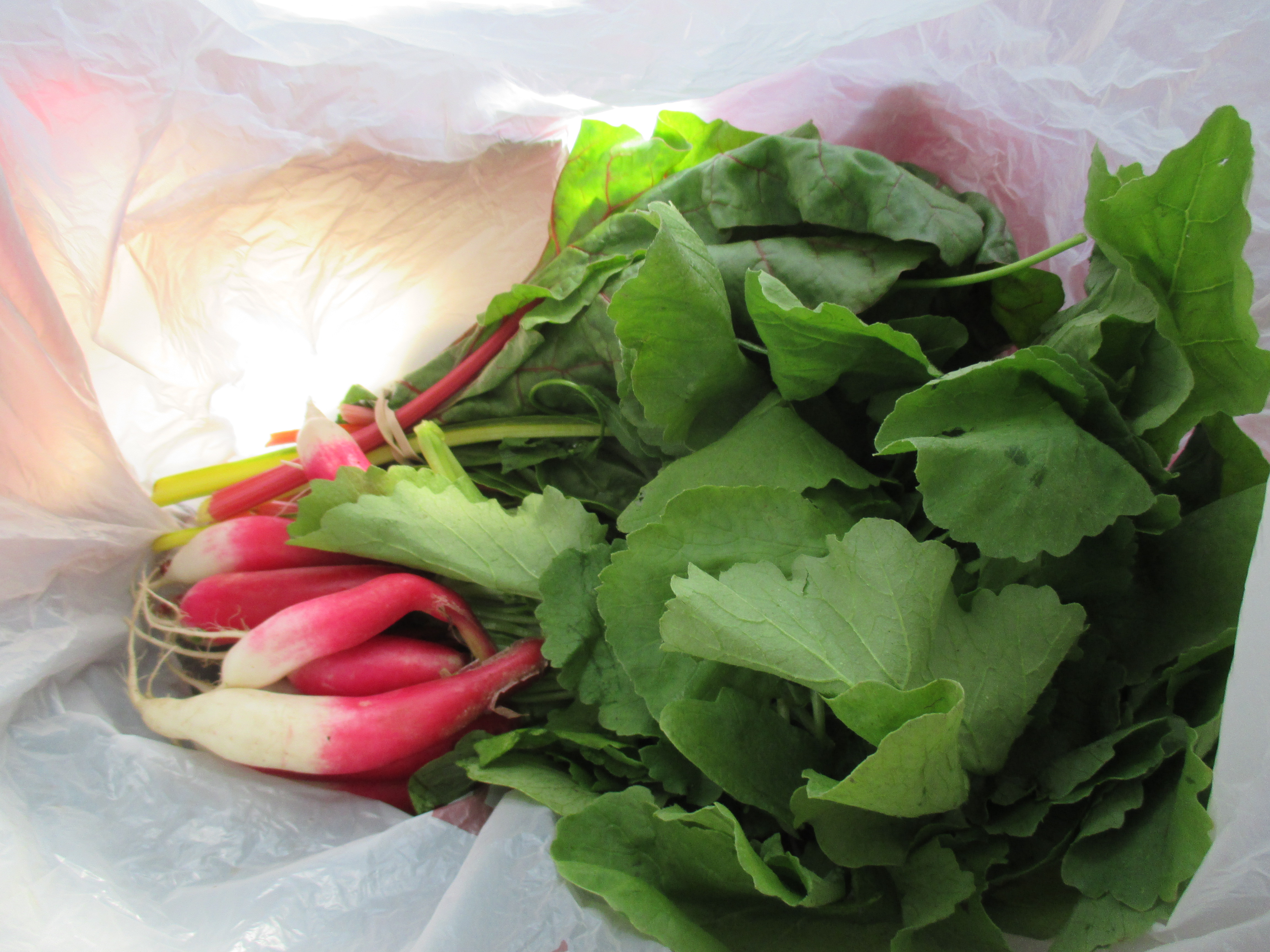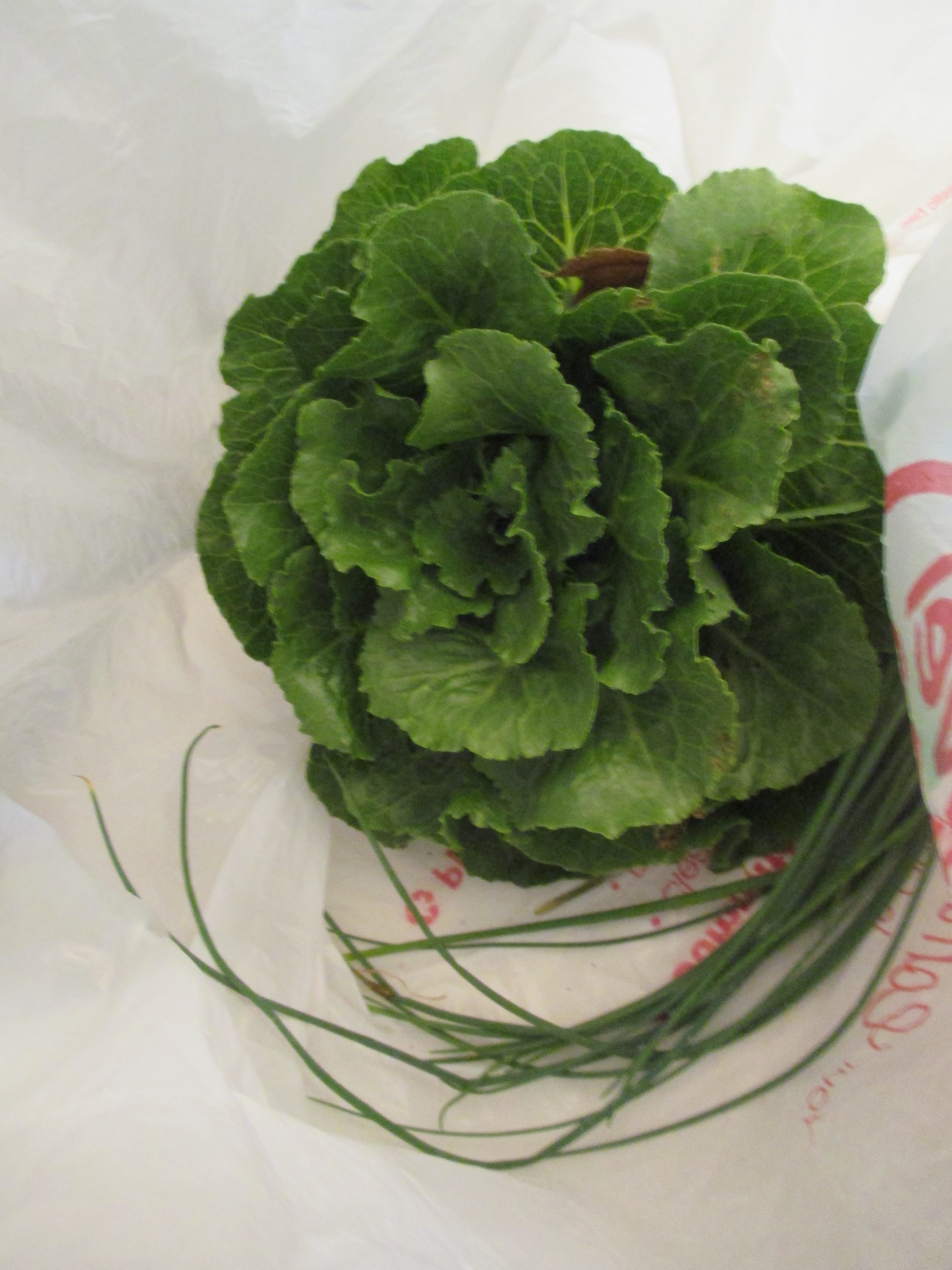 My friend doesn’t have a garden. These greens actually come from her friend’s garden. My friend is house sitting and some greens were just calling to be picked and eaten before they went to waste. And if anybody has any extra greens, I’m all too happy to eat them. Granted, I finished the chapter I was working on before I hopped in my car to zoom across town…