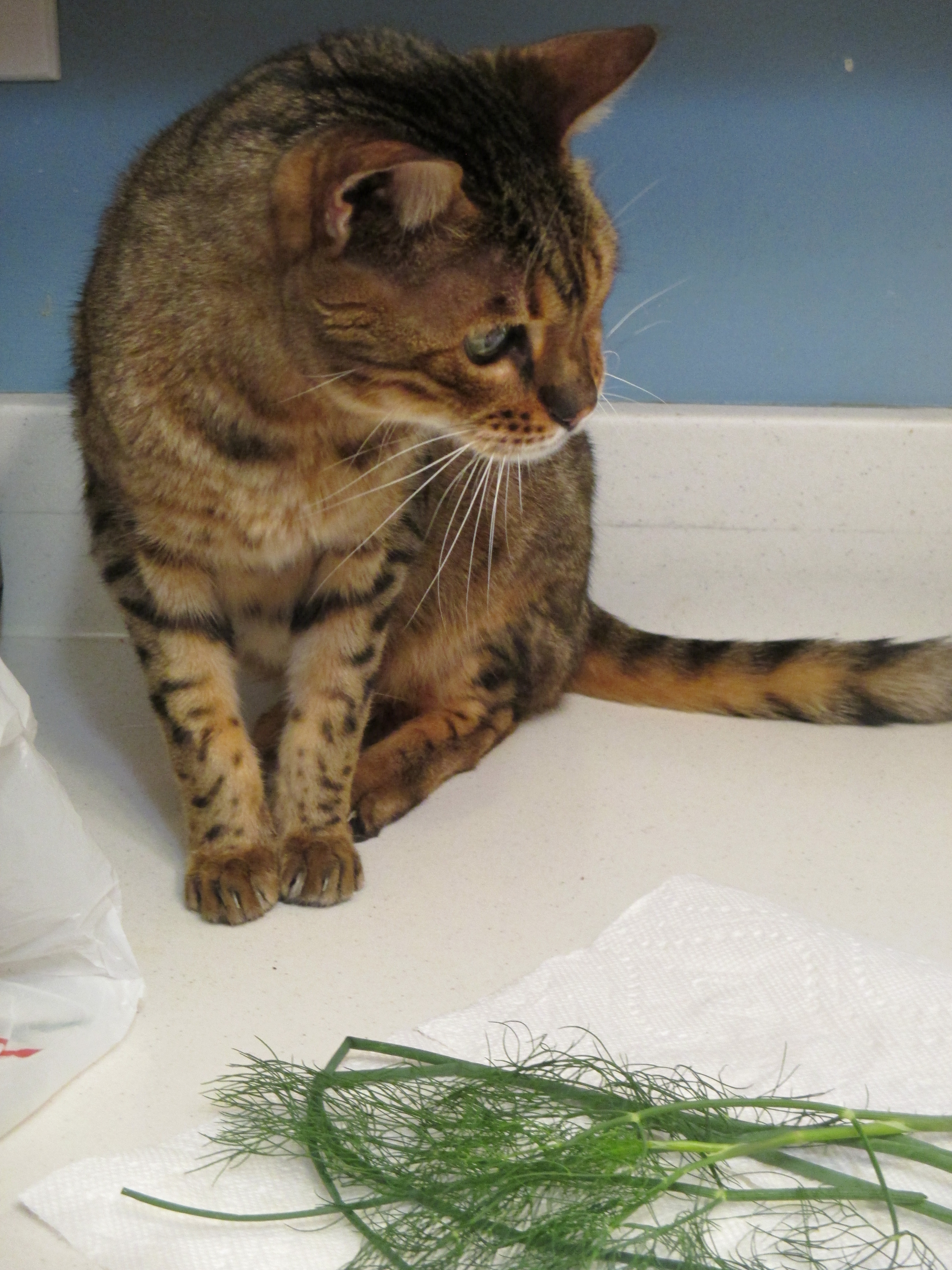 Tiddo the cat was checking out the herbs before I even knew he was in the kitchen with me. He wanted to see if the greens were some of that fresh catnip I nab from neighbors’ front lawns from time to time…