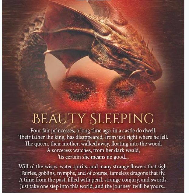 Four fair princesses, a long time ago, in a castle do dwell. Their father the king, has disappeared, from just right where he fell. The queen, their mother, walked away, floating into the wood. A sorceress watches, from her dark weald, ’tis certain she means no good…