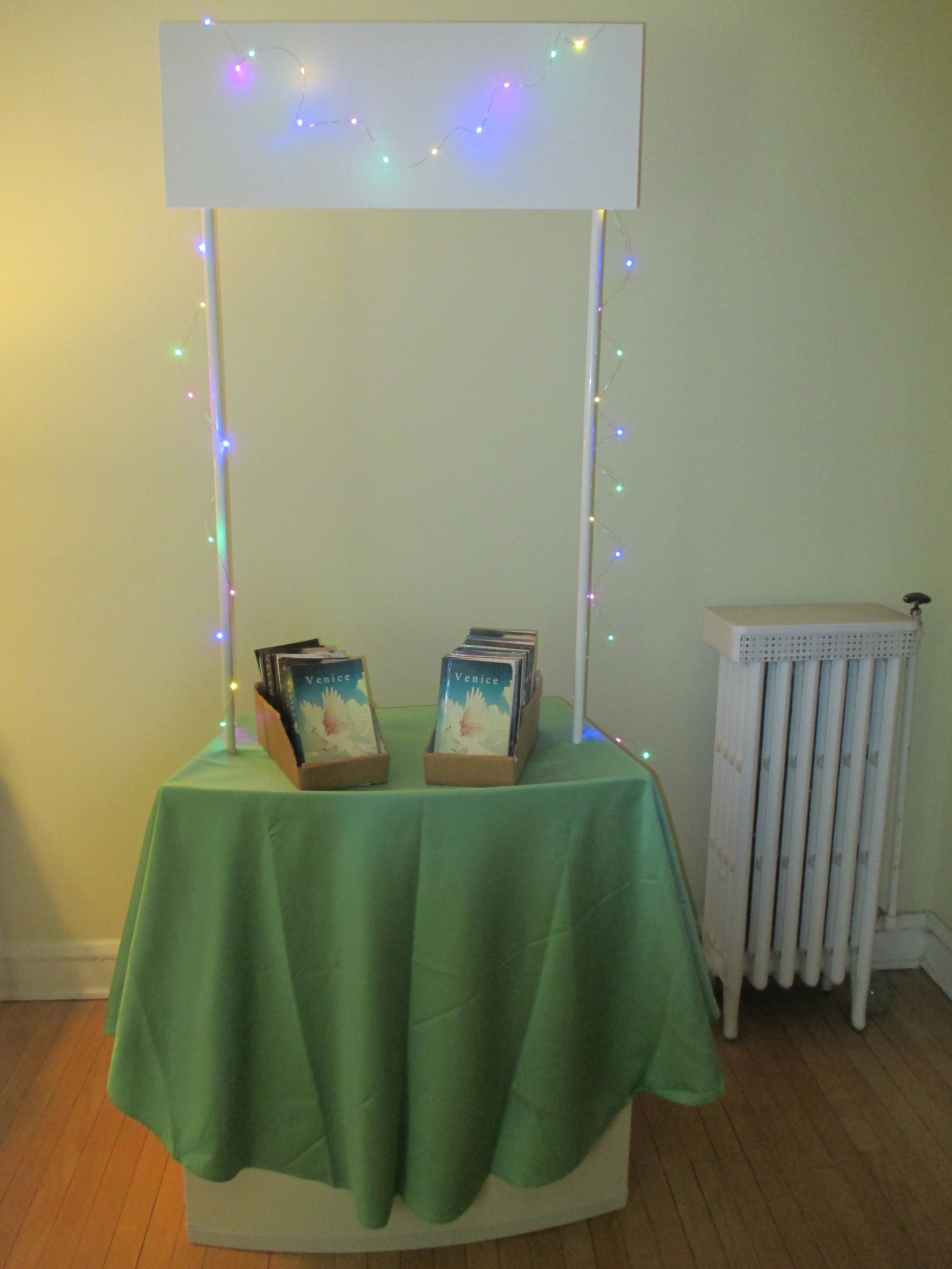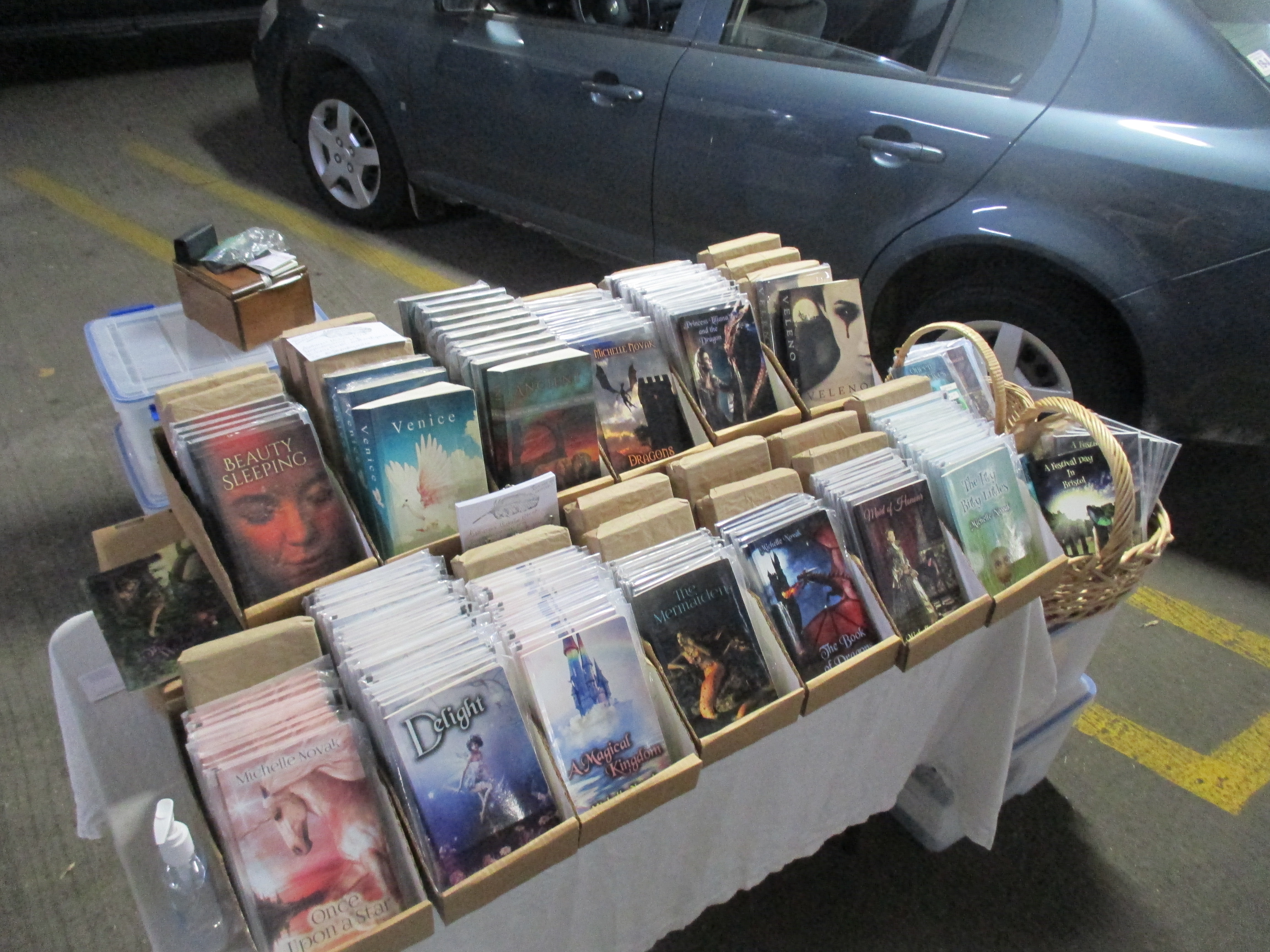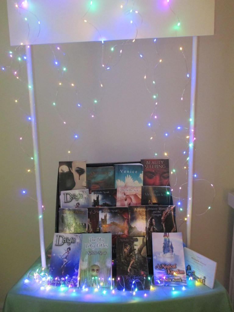 My pop-up bookstand is coming along! And it all fits in a few bags easily carried. I make my own magic, man! And you may think those are twinkle lights…but they’re fairies. They flew by to approve my shop.