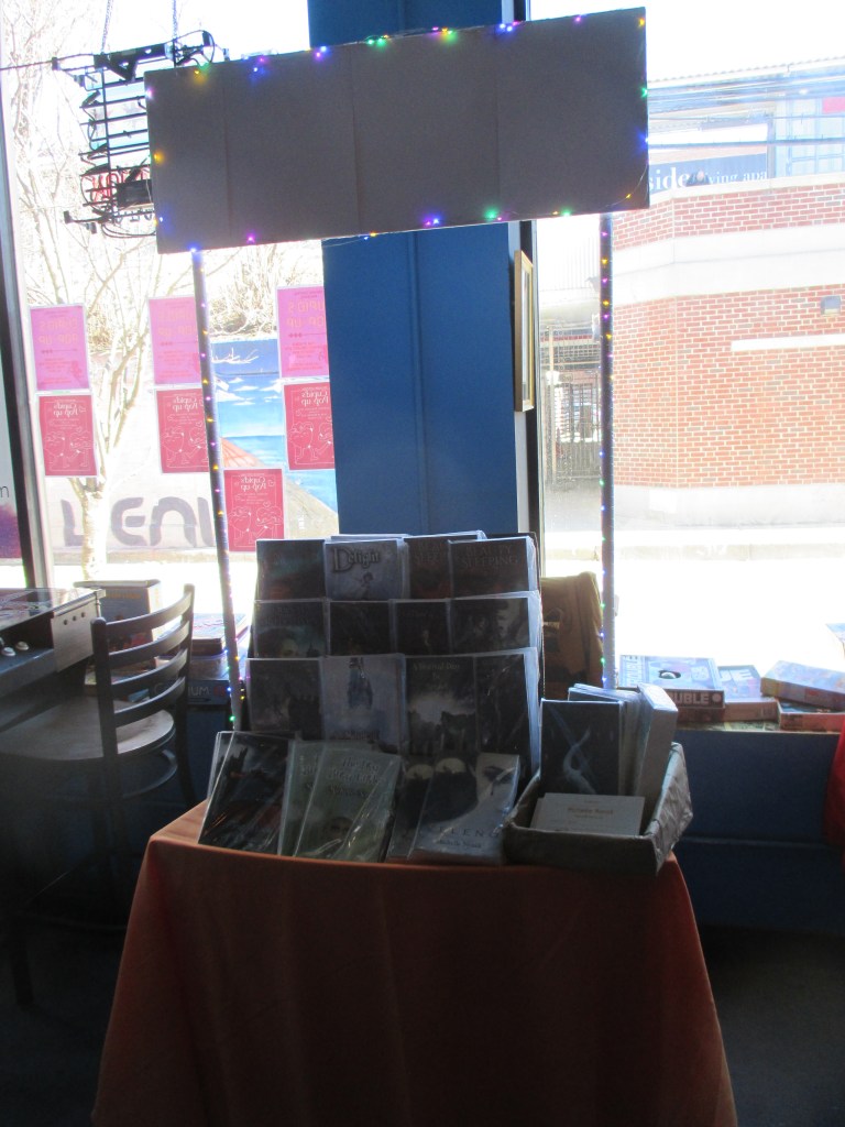 Just a mock-up…but this little kiosk collapses into a bag to go over my shoulder! Tiered cardboard bookshelf on the way will sit on top. Need batteries for lots more twinkle lights! Let’s see what I do with the sign. Storage in the back for extra tales. Starting February, my little mobile bookshop and I will be L hopping. I owe you some visits, Chicago! Come along on the adventure with me…