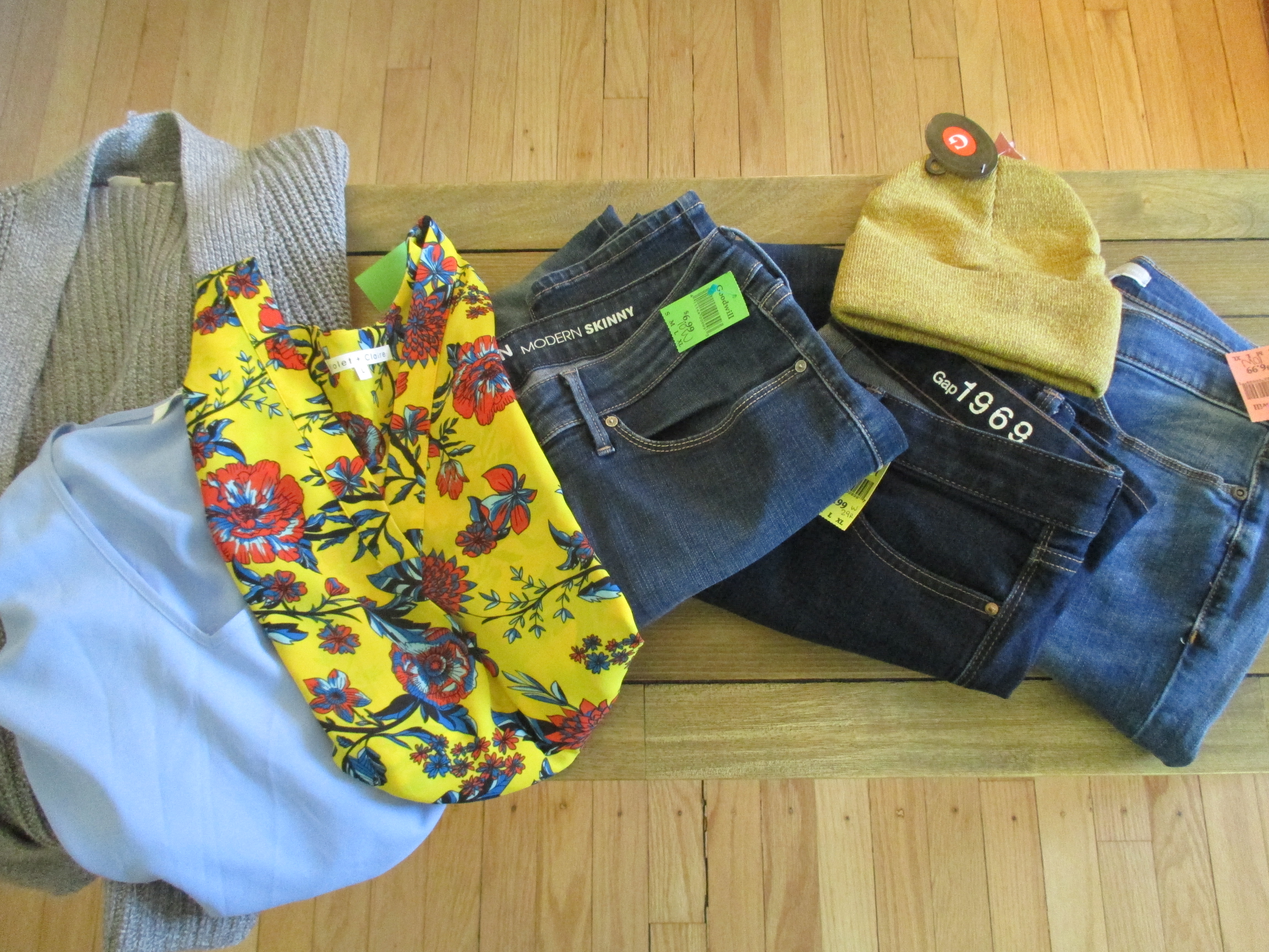 But you know what? I did something yesterday that I should have been doing even years ago when I stepped out to the stores. I went thrifting at Goodwill. I walked away with a heart so full, friends. For about $55, I left with 3 jeans, 2 sweaters, 2 blouses, 1 flannel, 2 black slacks, a winter hat, a scarf (not all seen here in the photo). Everything so beautiful and like new!