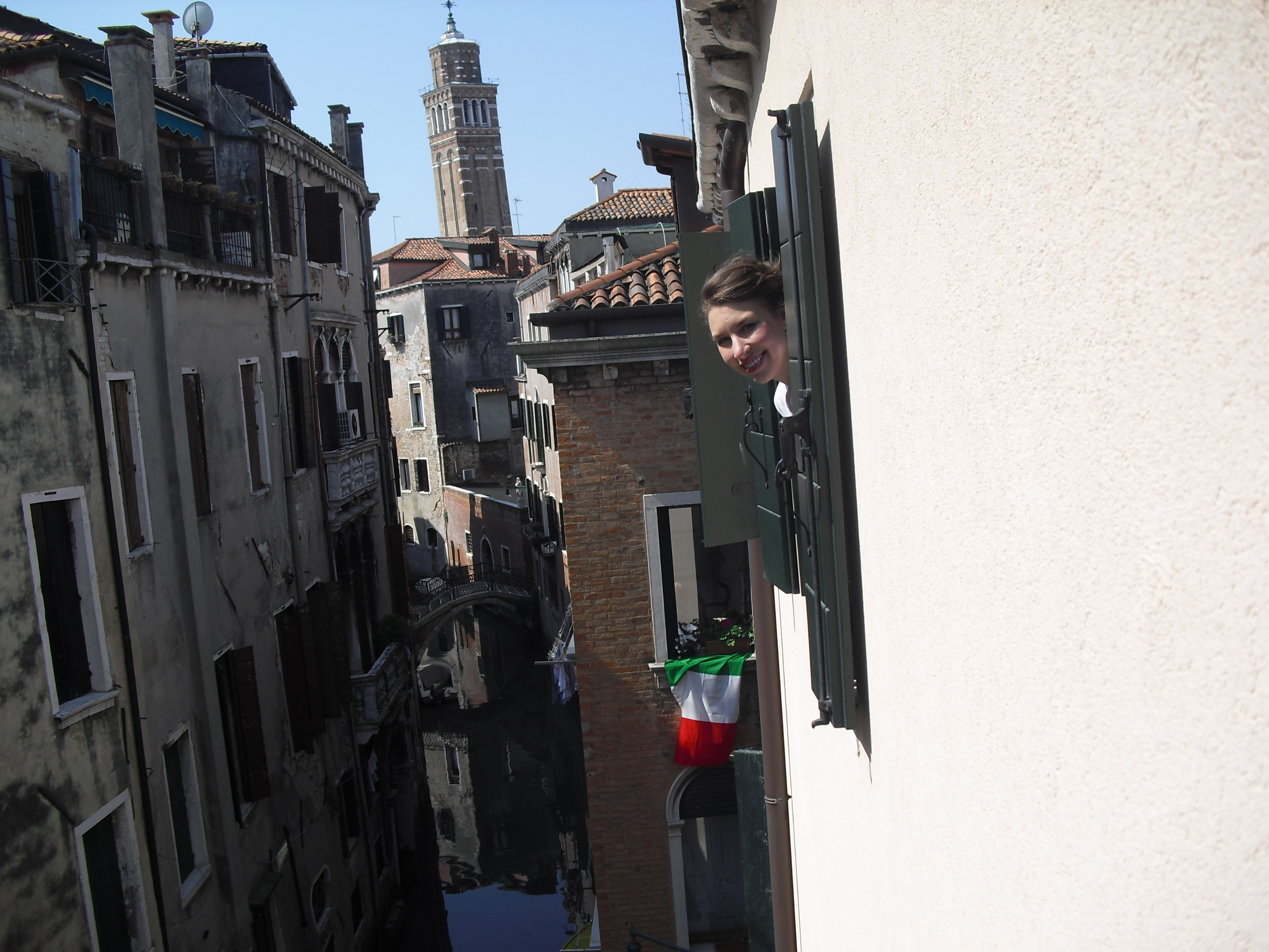 How lovely to stick one’s head out of the window and get a view, whether in Venice or anywhere else! Here, I was listening to the gondoliers’ barcarole, watching them float by, observing folks as they ambled across the bridge. I couldn’t help smiling at the pigeons rising from the rooftops with their usual cooing. The air was cool, with that hint of the sea.
