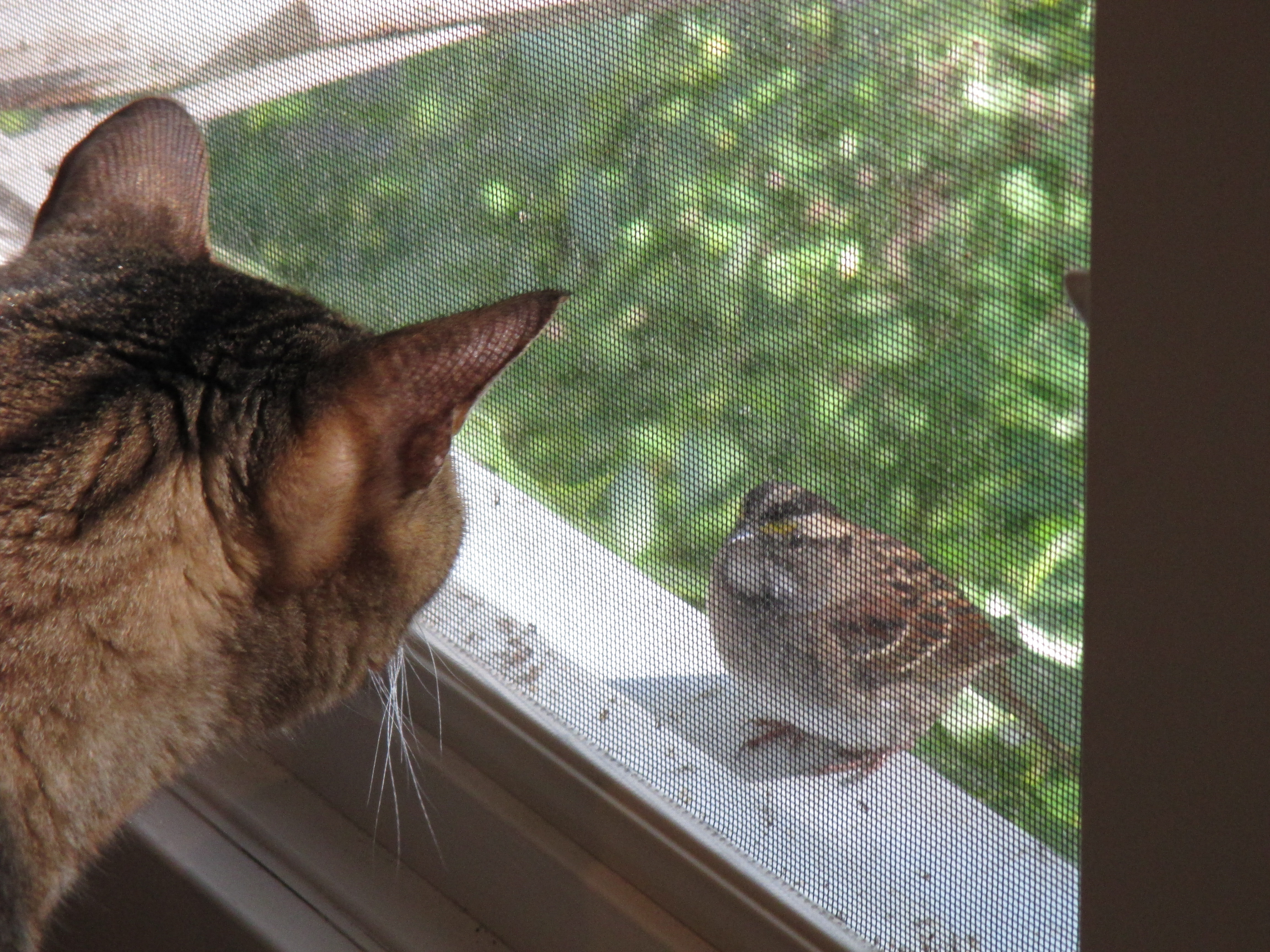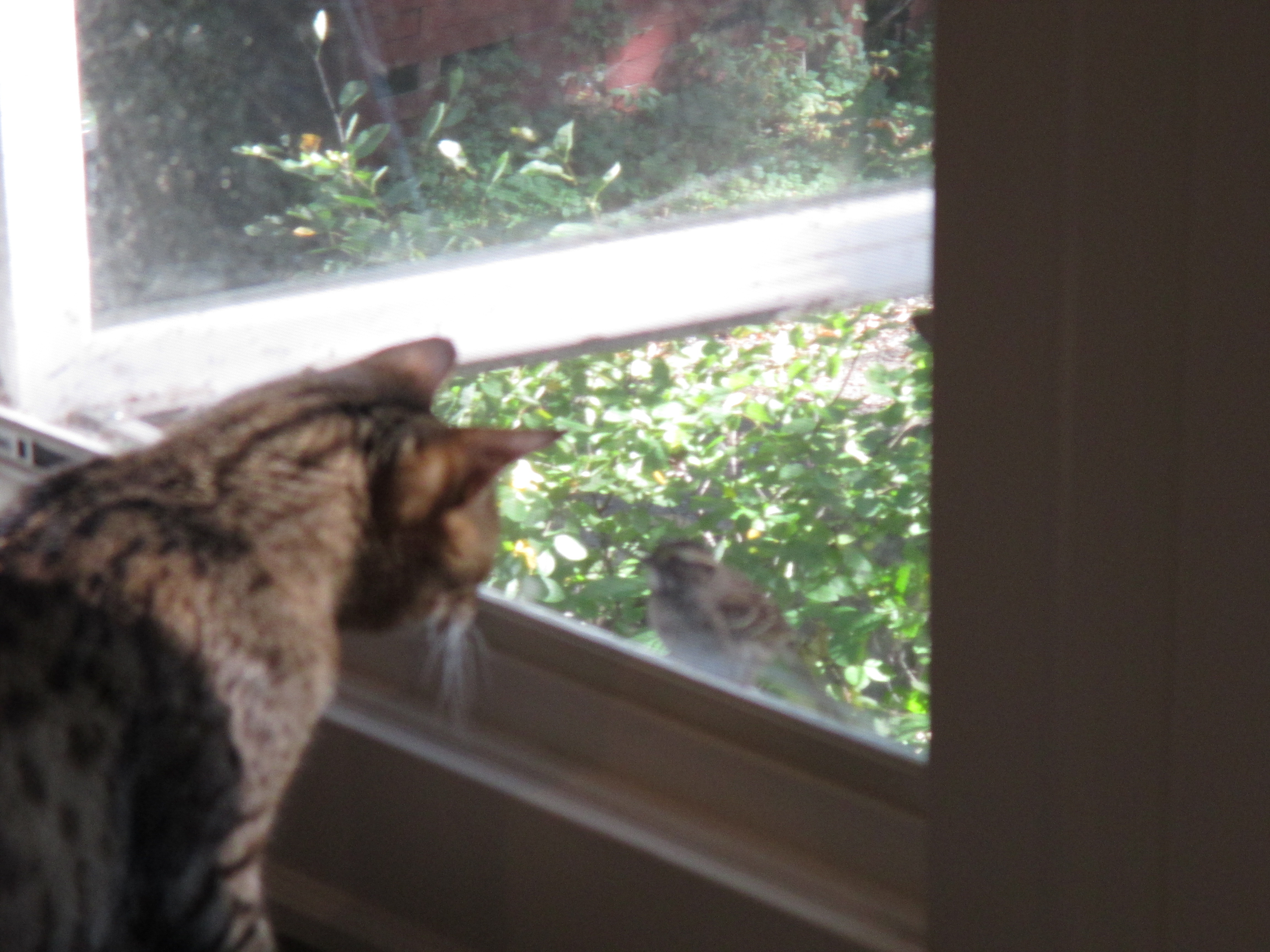 So, I’m making coffee this morning and looking out into the sunny backyard. I see something! Is it what I think it is? Is it the bird! I tear off up the stairs faster than Tiddo the cat on one of his running rampages, snatch up my camera and fly over to my bedroom window. First time I really saw it as not just a flash of wings, but as a sedentary creature! And let me tell you, it’s a big one. Larger than I thought. He (or she) is living off of chipmunk, bird, bunny and squirrel meat. These backyards are no slim pickings for this fierce hunter…