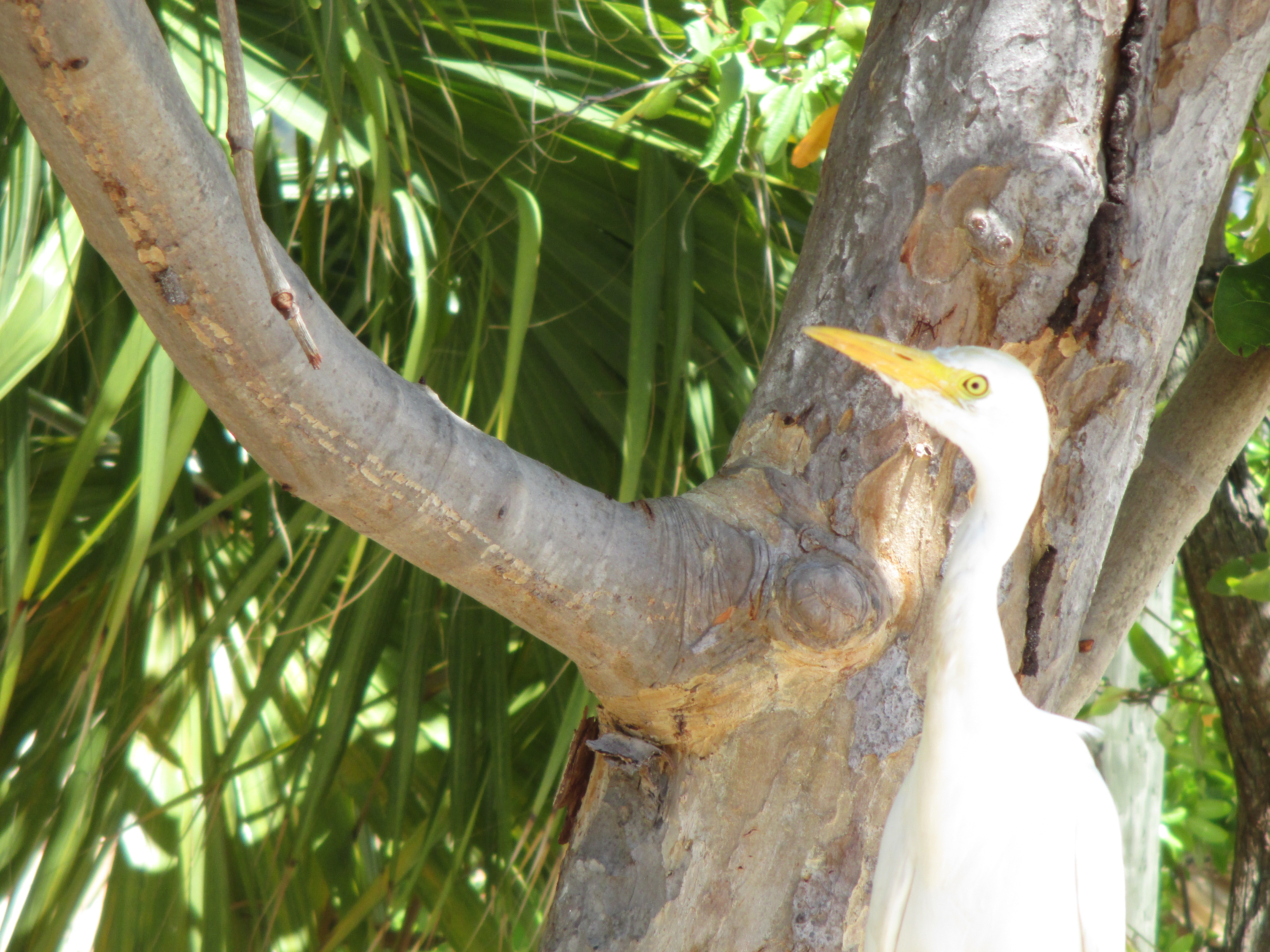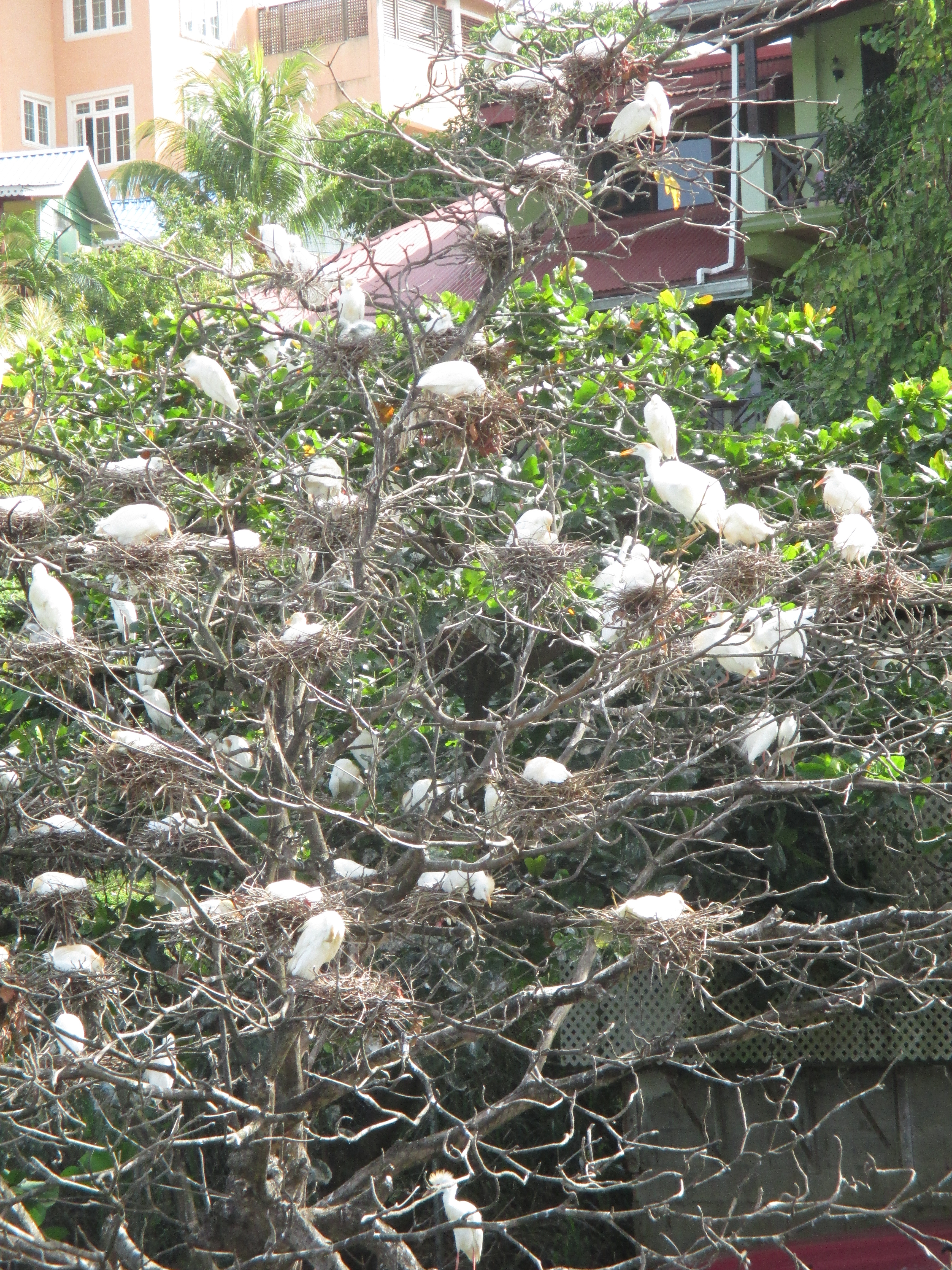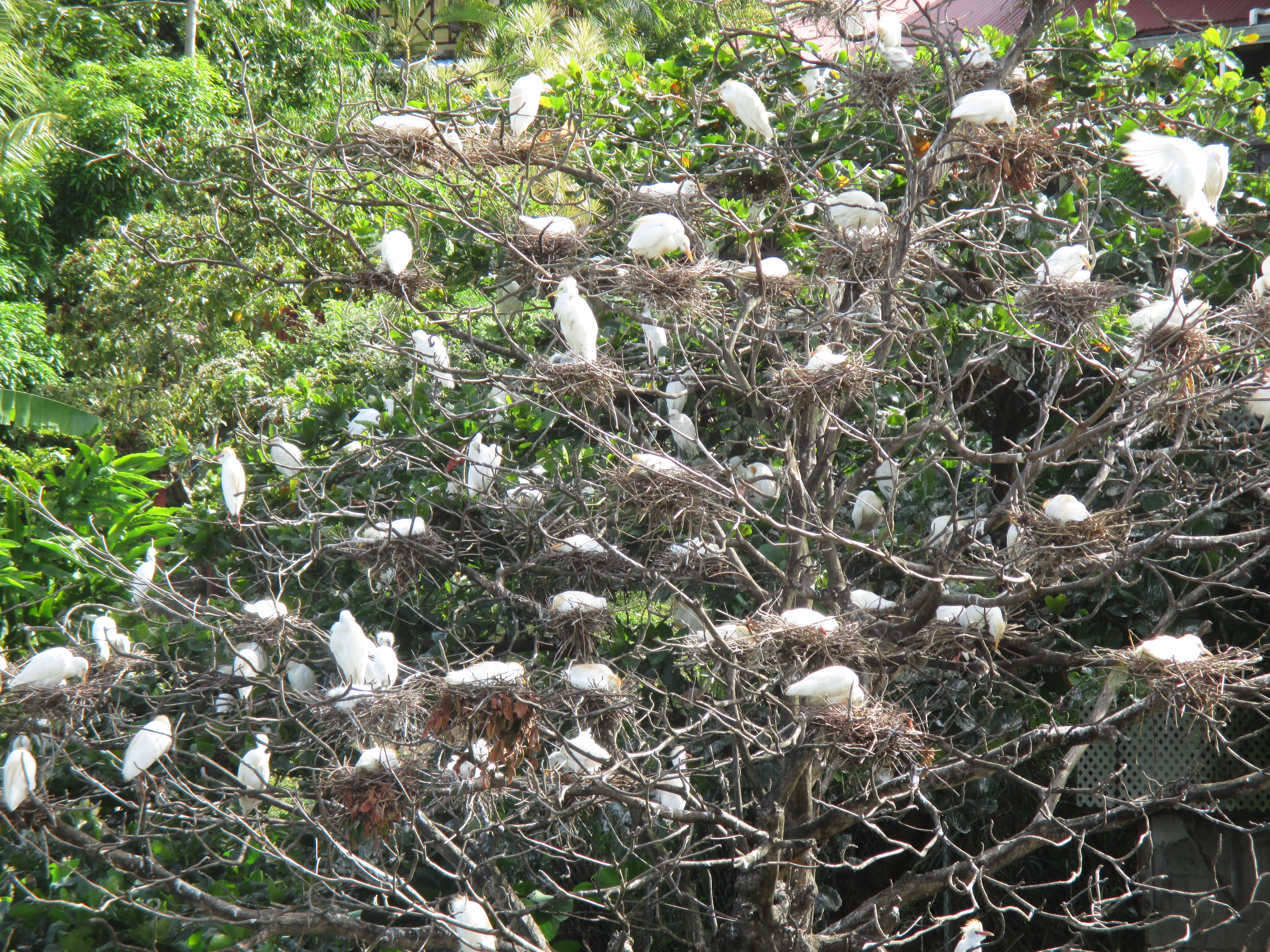 Great Egrets are members of the heron family of birds, which like to stalk their food in shallow waters (creatures like fish and frogs). They spear their catch with their beaks. In Illinois where I live, you might catch an occasional glimpse of one stalking fish in the waters of a conservation area during the warmer months, but these birds are truly lovers of tropical places. Since I’ve only ever seen a handful of lone egrets where I’m from, these trees filled with fuzzy headed egret babies just about took my breath away!
