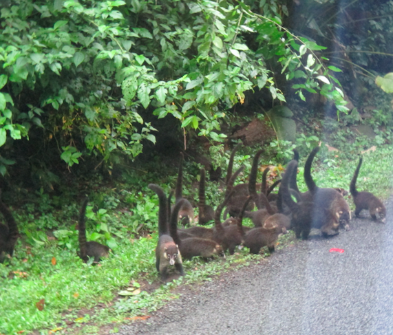 The animals were white-nosed coatis. They are also called pizote or coatimundi, among other names and are of the raccoon family. Different from raccoons however, coatis are not nocturnal. Instead of coming out at dusk to search for food, they sleep in trees at night and wake at dawn. Further, male coatis are far larger than females and like to remain solitary. The gals however, run around in crowds with their babies! The photo I took therefore, most certainly comprised only females and their little ones…